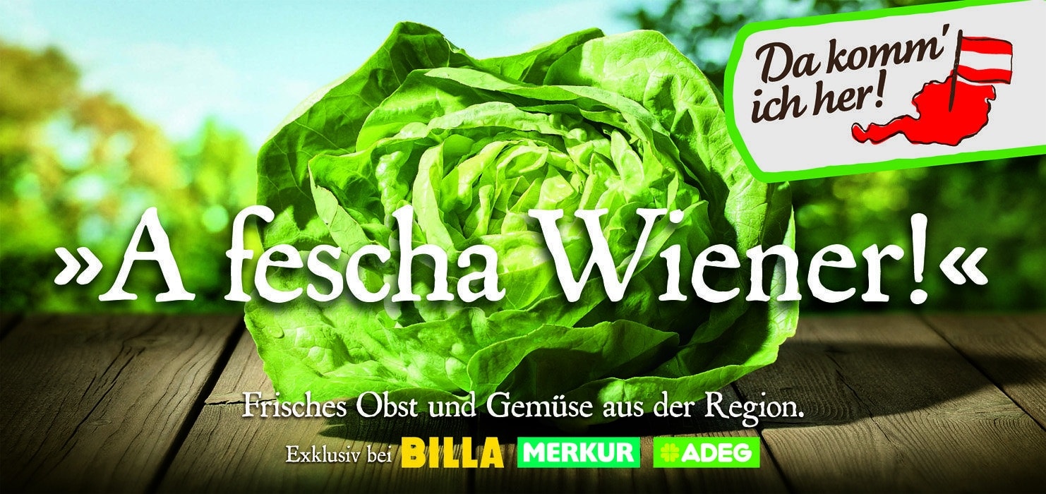 Frisches Obst und Gemüse aus der Region wird im Herkunfts-Dialekt auf Plakaten, im Radio und Online vorgestellt und beweist auf den ersten Blick, woher die Produkte kommen. So ist die „siaße Steirerin“ etwa eine reife Kirsche, die „beerige Vorarlbergerin“ eine schmackhafte Heidelbeere oder der „fesche Wiener“ ein grüner Häuptelsalat. Ganz nach dem „Da komm‘ ich her!“-Prinzip „Aus den Regionen für die Regionen“ funktioniert auch das Plakatierungskonzept.