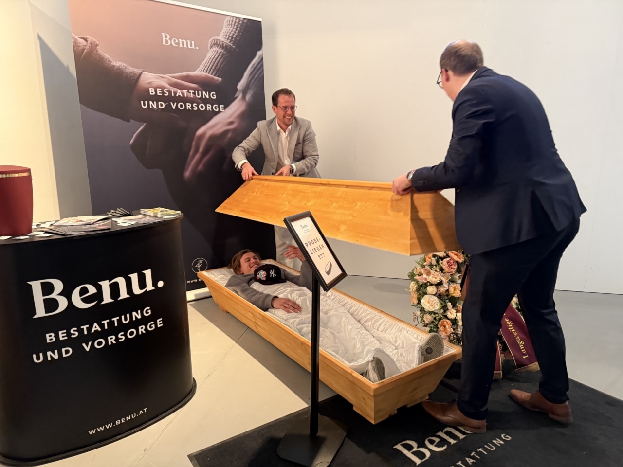 Davor und danach gab es Gelegenheit zum Networking. Softdrinks und kleine Snacks begleiteten die Gespräche. Ein ausgestellter Sarg von Benu konnte vor Ort begutachtet werden. Sogar Probeliegen war erlaubt und erwünscht, was einige Gäste auch nutzten.