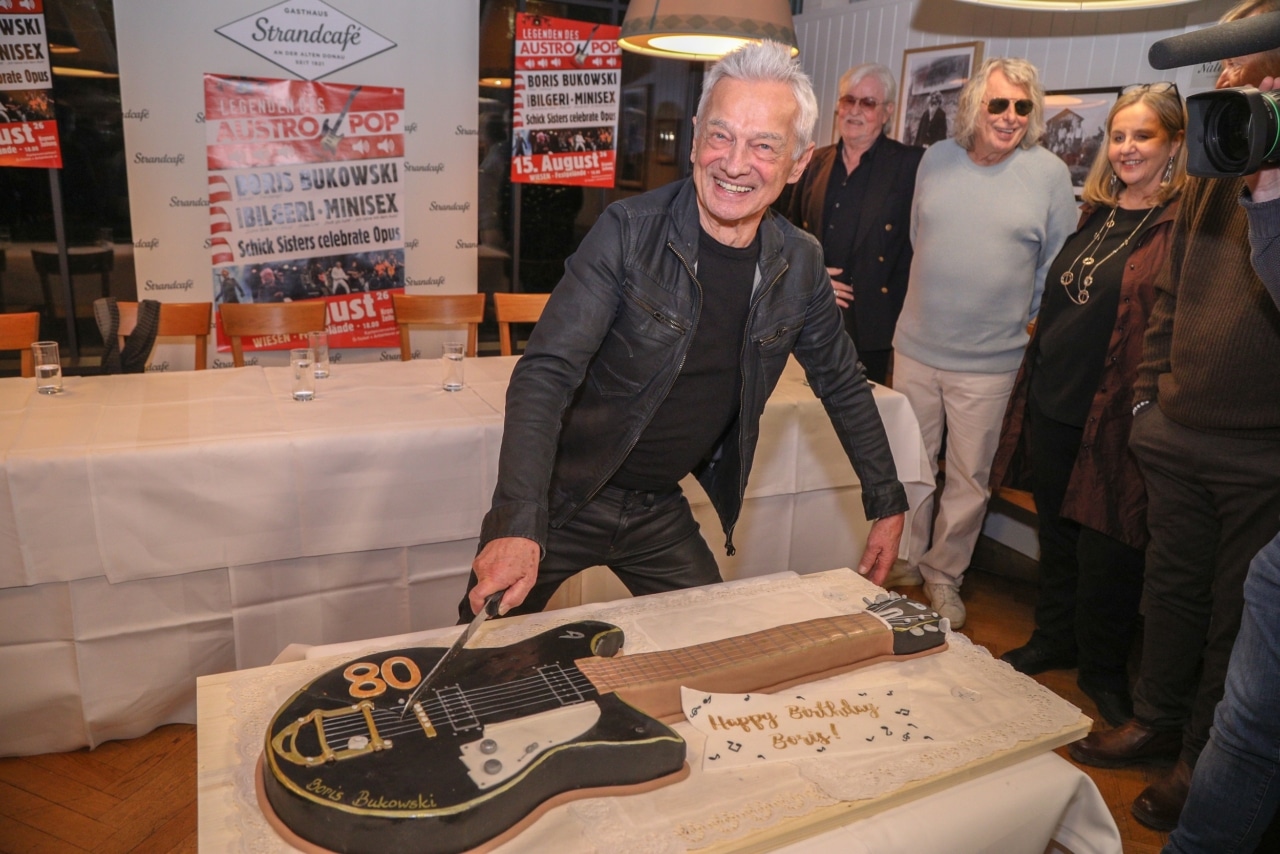 Mit dabei waren Reinhold Bilgeri, Rudi Nemeczek von Minisex, die Schick Sisters sowie Ewald Pfleger, der als kreativer Kopf von Opus internationale Popgeschichte schrieb. Als Überraschung gab es für den Jubilar eine Geburtstagstorte in Gitarrenform – serviert von Veranstalter Wolfgang Werner, Musikmanagerin Elisabeth Schwaiger und Strandcafé-Wirt Andranik Yeritsyan.