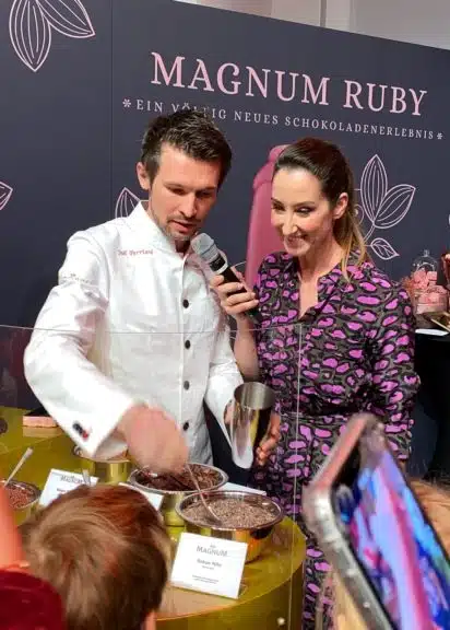 Magnum Ruby ist ein weitere innovatives Markenprodukt aus dem Hause Unilever, das für Staunen unter den VIP-Gästen bei der Präsentation von Eskimo in Wien, am 17.2. sorgte. “Ruby” ist tatsächlich die vierte Schokoladenart nach der gebräuchlichen Trennung zwischen heller, dunkler und weißer Schokolade. Hergestellt wird die rosa Schokolade aus Kakaobohnen, die eine natürliche Färbung des Endproduktes bewirken. Die Schokoglasur des neuen Magnum Ruby hat keinerlei zusätzliche Farbstoffe, um den auffälligen altrosa Ton zu erzielen. Chef-Chocolatier Joel Perriard erklärte keymedia.at, dass fünf Jahre nötig seien, bevor eine Kakaopflanze Früchte trägt, die geerntet und zu Schokolade verarbeitet werden kann. Die Schwierigkeit bei der Herstellung der Ruby-Schokolade besteht darin, die rosa-färbenden Bohnen von den anderen zu trennen, damit der Farbeffekt natürlich entsteht.