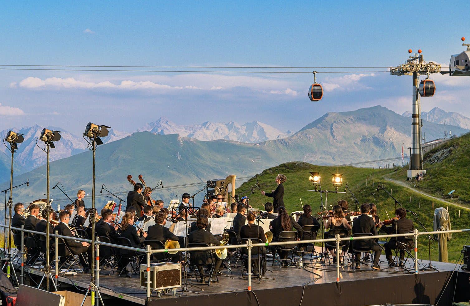 Diesen Sommer wird im Gasteinertal wieder an allen Ecken musiziert, getanzt, gefeiert und gelacht. Das Angebot an Kunst- und Kulturveranstaltungen kann sich sehen lassen und bereichert das Urlaubserlebnis in der Alpenregion. Klassikkonzerte, Almmusik, Jazz und musikalische Kunstdarbietungen erfüllen jeden Höhenmeter in Bad Gastein und Umgebung. Ob tief unten im Tal oder hoch oben am Berg – der Gasteiner Kultursommer 2022 sprengt alle Grenzen. Zu Beginn des intensiven Programmreigens fand am 22. Juli unweit der Bergstation der Schlossalmbahn in Bad Hofgastein ein besonderes Spektakel statt. Die Philharmonie Salzburg spielte in voller Besetzung auf 2.066 Metern Seehöhe ein Konzert, dessen Töne rund 1.500 Zuseher unter freiem Himmel lauschen konnten.