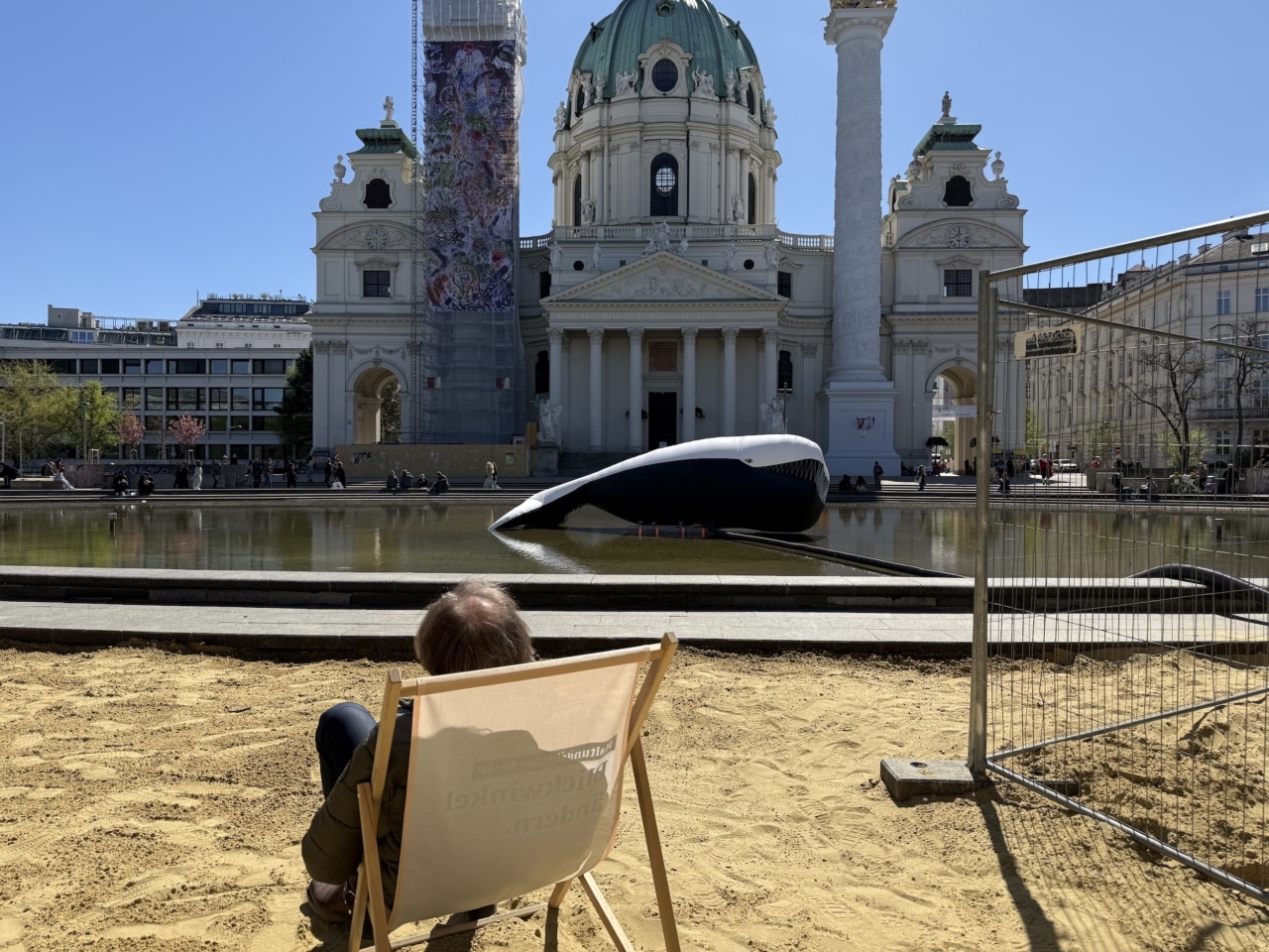 Ein zentraler Ort der diesjährigen Klima Biennale ist der Karlsplatz, wo mehrere großformatige Installationen rund um die Karlskirche umgesetzt wurden. Besonders auffällig ist das Projekt „Kaorle am Karlsplatz 2026“ der Künstlerin Margot Pilz, das auf ein früheres Werk zurückgeht und in einer neuen Version präsentiert wird. Teil der Installation ist ein aufblasbarer Wal im Wasserbecken vor der Kirche, der als Replik eines historischen Originals ausgeführt wurde.
