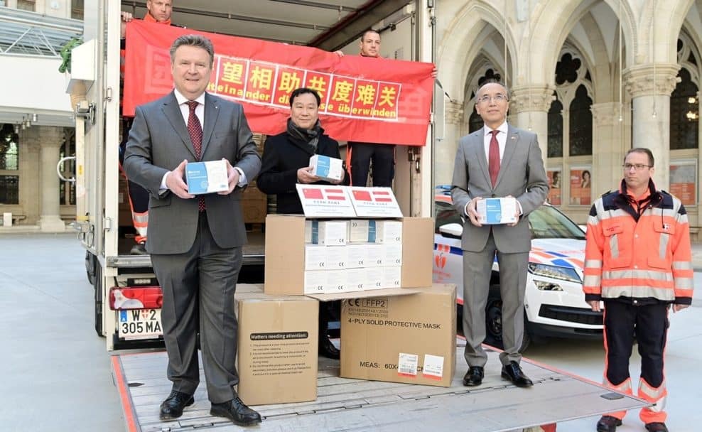 Bei der Übergabe im Arkadenhof des Wiener Rathauses betonte Chinas Botschafter „Österreich mit Wien und China stehen zusammen“. Er erinnerte auch an die Unterstützung aus Österreich für die Region Wuhan nach dem Ausbruch der Corona-Epidemie. Die Masken seien als Dank für die damalige Hilfe zu verstehen. Die mehr als 39.000 Schutzmasken wurden von der Berufsrettung Wien in ein Lager gebracht. Spitäler, Rettungsorganisationen oder andere Einrichtungen, welche für die Versorgung und Pflege von Covid-19-Erkrankten zuständig sind oder Corona-Verdachtsfälle betreuen, können die Masken anfordern, erklärte Rainer Gottwald, Leiter der Berufsrettung Wien. „Diese Mundschutzmasken sind ein sichtbares Zeichen der Verbundenheit der chinesischen Community mit der Stadt. Auch in schwierigen Zeiten stehen wir zusammen“, sagte Ludwig. Internationalen Solidarität sei in schwierigen Zeiten wichtig: „Gemeinsam werden wir die Krise überwinden“, zeigte sich der Stadtchef optimistisch.